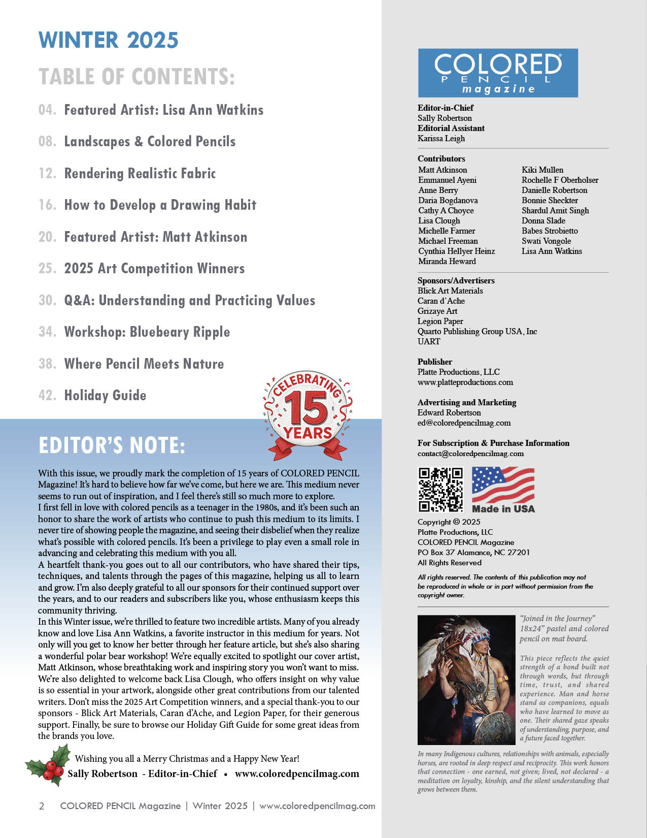 In this issue: Landscapes & Colored Pencils, Rendering Realistic Fabric, How to Develop a Drawing Habit, Understanding Value, Polar Bear Workshop, Where Pencil Meets Nature, 2025 Art Competition Winners, Holiday Gift Guide, and more. Featuring Lisa Ann Watkins and Matt Atkinson